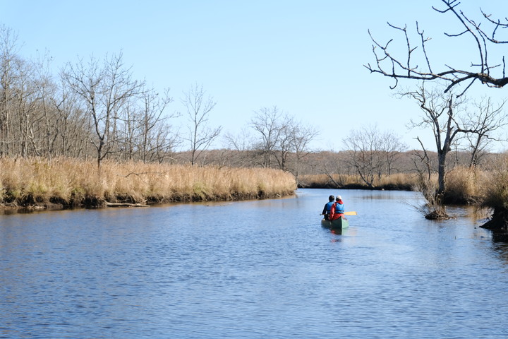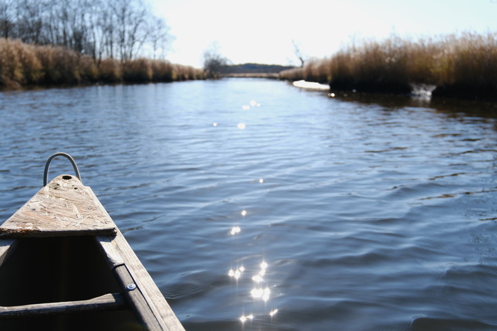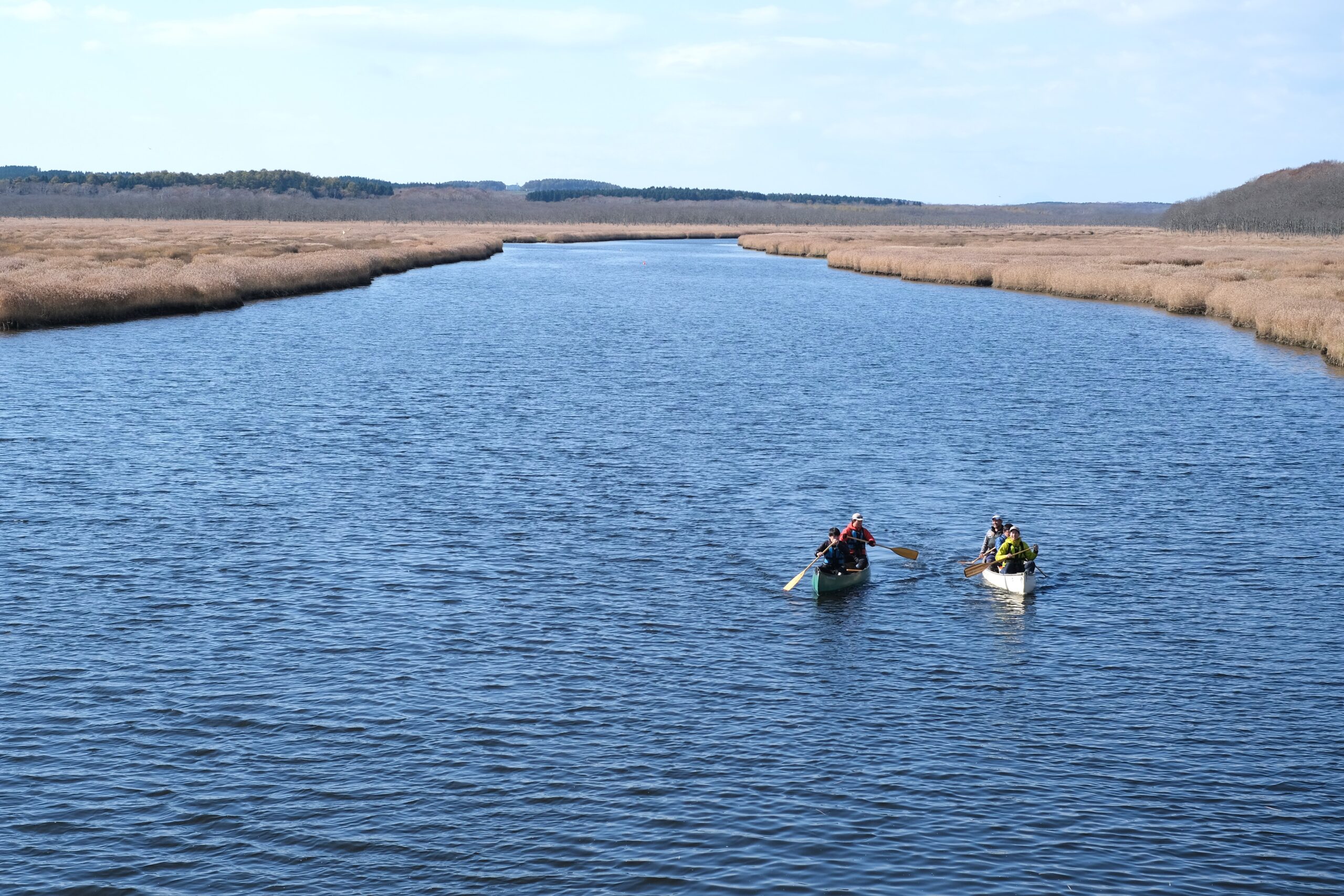 絵本のページをめくるように、蛇行の度に目の前の景色がゆっくりと入れ替わる。一面の青い空と、それを映す穏やかな水面、白茶けたように乾いた両岸のヨシ。要素は変わらないけれど、そのバランスや構図の変化で感じがぐっと変わる。子どもの頃のような瑞々しい感性と澄んだ五感が美しさに感動している。こんなにも穏やかに、震えるように心が動くのは久しぶりだ。