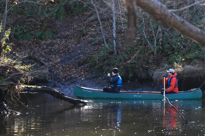 しばらくすると赤い橋が見えてきた。JR標津線が通っていた頃の名残で、今日の航路にかかる唯一の人工物だそう。たしかに、川にかかるどころか、周囲にも人工物はほとんど目にしていない。そういえば話し声以外の音もほとんどなかった。