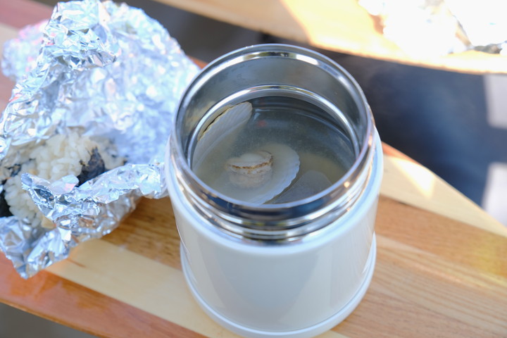 ゴールの万年橋が見えた頃、右手にある浅瀬にカヌーを乗り上げてランチタイム。おにぎりとホタテのスープがパドルから提供される。この川が注ぎ込む風蓮湖のさらに先、尾岱沼で獲れたホタテの稚貝のスープは冷えたからだにじんわりと沁みわたる。穏やかな向かい風を浴びながら、最後はしっかりパドルを漕いでゴール。