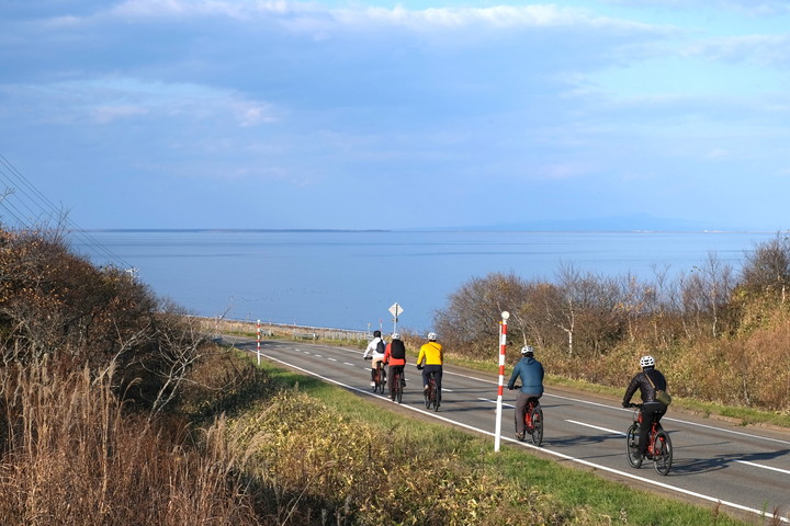 ヤウシュベツ川が注ぐ風蓮湖を横目に進み、起伏をいくつか越えたら右手に海が見えてきた。ここからはヨシが生い茂る湿原と根室海峡の間を進んでいく。車通りは少なく、人の気配もない。潮風に生活のにおいをかき消された、ただ移動するためだけのような道。再び訪れた静けさの中でペダルを漕ぎながら、原野の余韻に浸る。
