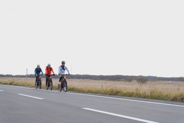 ここからは自転車に乗り換え。パドルを置いて、ペダルに脚をかける。「さあ、ここからは自らの脚で、力で!進んでいきましょう!」と鈴木さんが先頭をゆく。目線はぐっと高くなり、速度を上げて、風をきる。凪いだ心が昂っていく。