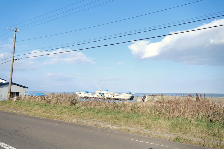 ふと気づけば、自転車にまたがる影が少し伸びてきた。海にはブイが一列に浮かび、道路横では漁船や漁具の姿も。右から香っていた潮の匂いには、だんだんと磯の感じが強まってきた。漁師まちが近づいている。