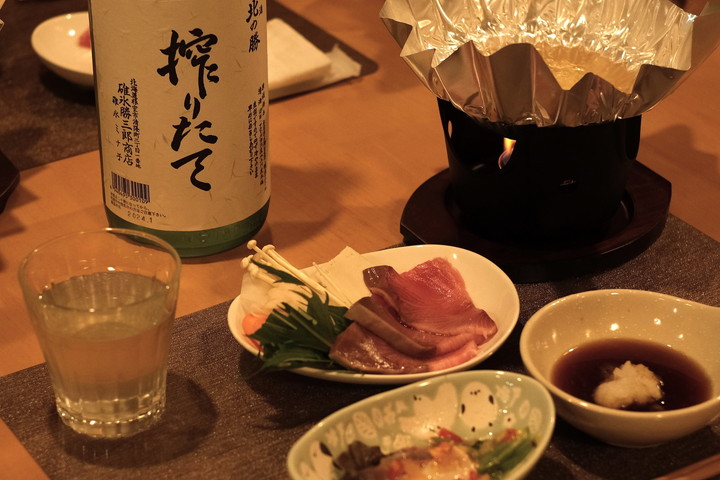 尾岱沼産ホッキのカルパッチョを皮切りに運ばれる、目にも幸せな料理の品々。漁獲量が増えているというブリのしゃぶしゃぶは羅臼昆布のだしに合わせていただく。とろけるようなブリの身はもちろんのこと、上質な脂が溶け出した昆布だしはお椀で飲みたいほど格別な味わい。五臓六腑に染み渡るとはこのことだ、と大きく頷きながらすすり続けた。「そしたらこれも必要だね」と注いでくれたのは、おとなり根室の地酒「北の勝 搾りたて」。ああ、これ以上、どこに染み渡ろうか。まさに野付のフルコース。序盤から贅を極めたテーブルだ。