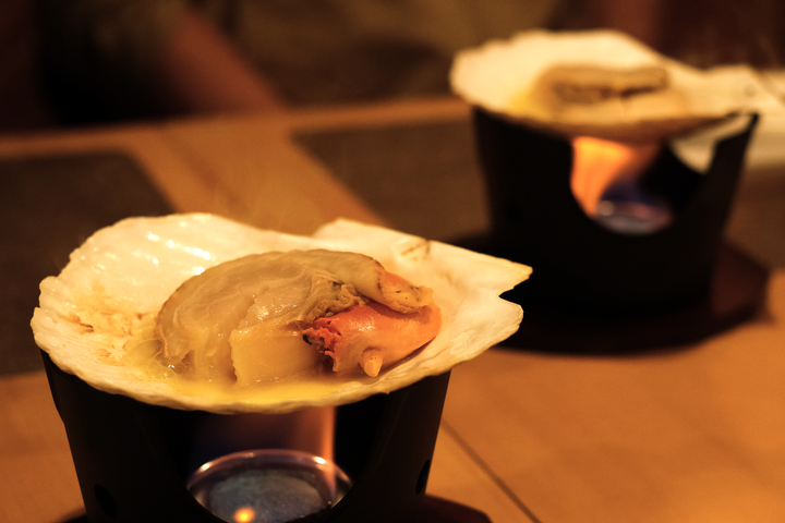 尾岱沼の名産北海シマエビに続いて登場したのが、見事なまでに大ぶりなホタテ。「これが筋トレで仕上がった貝柱ですね」と感嘆の声が上がる。一口で頬張れば、噛めば噛むほどに甘みと風味が口の中に広がっていく。